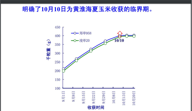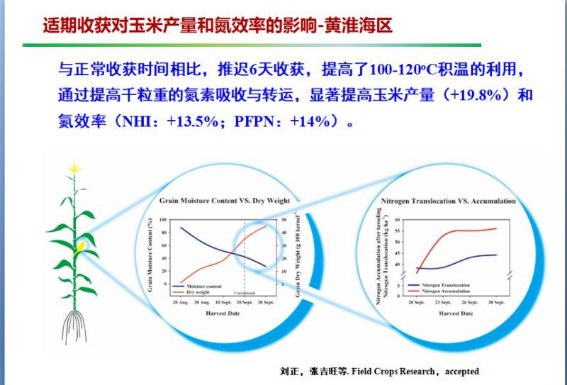 一是山东农业大学刘正博士和张吉旺博士的科研结果,“活秆成熟”的品种适当晚收获6天,就可以“白捡”1/5的产量(见附图,增产率19.8%)。黄淮海区域的8个省,夏玉米在10月6日~20日之间收获,千粒重最高。