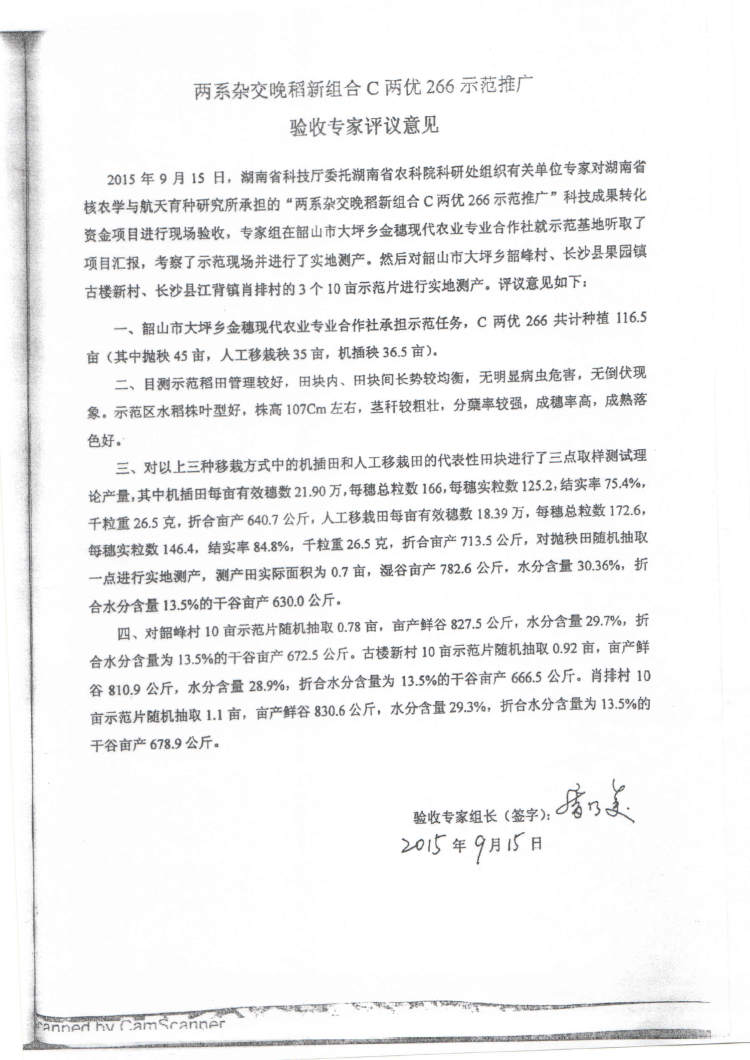 C两优266靖州、长沙县两地专家现场测产验收结果