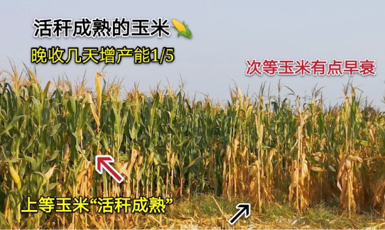 一是山东农业大学刘正博士和张吉旺博士的科研结果,“活秆成熟”的品种适当晚收获6天,就可以“白捡”1/5的产量(见附图,增产率19.8%)。黄淮海区域的8个省,夏玉米在10月6日~20日之间收获,千粒重最高。